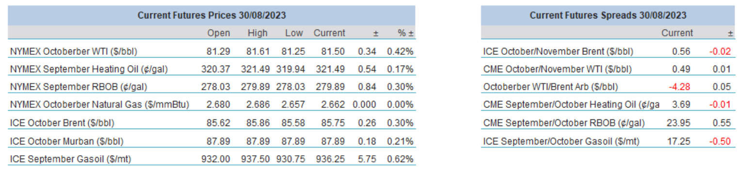 With the wisdom of hindsight, yesterday’s sharp intraday sell-off that took place after New York opened was never going to last. Firstly, tropical storm Idalia, which might reach a Category 4 hurricane status today, served us with a stark reminder that it is that time of the year when US Gulf Coast oil production and refinery operation can be adversely affected. Although the ironically named weather phenomenon, which means “loveable” will avoid the region’s main refining hub, oil major Chevron took pre-emptive steps and evacuated non-essential staff from three of its platforms – hence the rally in crude oil prices. Products were lagging and settled broadly unchanged as no disruption to refinery operation has been reported yet and Marathon is on the verge of restarting previously closed units at its Garyville, Louisiana refinery. The expected 3.3 million bbls draw in US crude oil inventories (Reuters poll) further boosted the confidence of oil bulls. It turned out to be even more price supportive. The API reported a plunge of 11.5 million bbls with product stockpiles fattening some.
