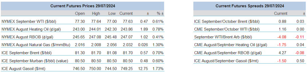 In numbers, M1 futures finished last week in the following manner. WTI -$2.97/barrel (-3.71%), Brent -$1.50/barrel (-1.82%), Heating Oil +0.06c/gallon (+0.02%), RBOB +1.01c/gallon (+0.41%) and Gasoil -$18.25/tonne (-2.42%). Confidence was severely dented by risk off in the wider suite but the state of China's industry worried prices lower and even a another draw down in US Crude oil stocks was not enough to temper the bout of current anxiety in oil prices. For this morning's fresh considerations, news again serves up equalizers. According to Reuters, in Nigeria Dangote refinery is re-offering crude barrels to the market as it undergoes technical issues and elsewhere Ukraine have claimed success in hitting a Russian oil depot in the Kursk region.