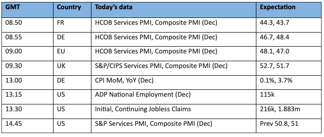 There is something of a cooling in the United States as the ISM Manufacturing PMI came in at 47.4, and although higher than the predicted 47.1, activity is someway short of expansion. Added to this was a reduction in JOLTs job openings at 8.79m versus an 8.85 call which is the first of the instalments of employment data continuing today with ADP employment and jobless claims and the very much eyed Non-Farm Payrolls tomorrow. The job sector is such a catalyst for forward thinking from fast money investors who have suffered a blow to confidence at the start of the year due to a taming in expectation of lower interest rates. This counter to recent thought culture was made all the more real as the minutes for the FOMC meeting in December were released in which FED members in the main saw current policy peaking but want rates to remain high for some time, and although there was no specific mention of what might happen in March, the month in which the first cut had been primed by dovish bets, the intentional obfuscation allows doubt for a cut delivery.