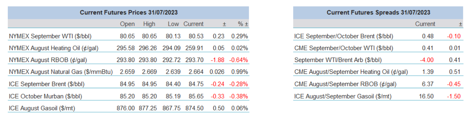 The oil complex had a particularly good week and bulls would have been greatly pleased with the progress made. The front month of all the major contracts; WTI +$3.51/bbl (+4.55%), Brent +$3.92/bbl (+4.84%), Heating Oil +21.29c/gal (+7.75%), RBOB +15.40c/gal (+5.50%) and Gasoil +$79.00/tonne (+9.94%) made great gains allowing an increase in bullish positions (as of July 25), particularly RBOB with total speculative longs at 89,278 lots which is the highest in nearly 2-years. Products led the way and net longs in Heating oil increased to 24,792 and to 55,208 in ICE Gasoil which is a 6-month high. Adding momentum to this increased long exposure were the taking out of some key technical resistances. This was not just the 200-day moving averages but that Brent, Heating Oil and Gas oil are now trading above their 50% retracement numbers of established highs and lows of 2023.