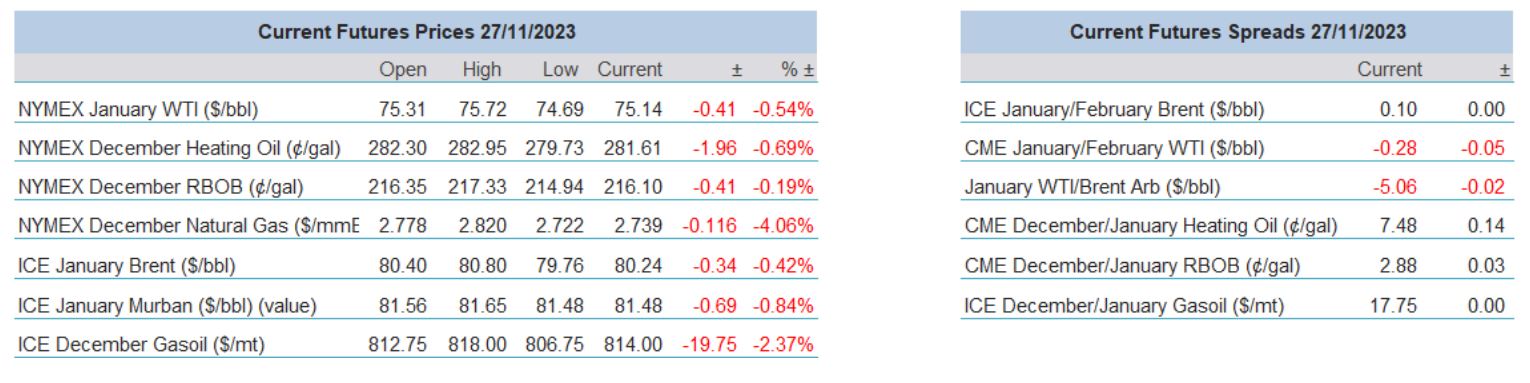 Last week was extraordinary, the moves breath taking, leaving participants feeling nauseous in dips and vertiginous in rallies in single day oscillations, and adding to the outer-world feeling is that the marker crudes chimed in with almost zero changes with WTI -$0.35/barrel on the week and Brent -$0.03. Bulls can claim some hope when tracking the positive finish to Heating Oil (+6.32c/gallon) and Gasoil (+$28.50/tonne), for any rally in margins or the crack representatives will bring back recent memories of the distillate inspired complex rally in September. Such notions were dealt several blows, not only from emotional drivers as Israel and Hamas conducted hostage exchange and the ceasefire held, the US again saw builds while maintaining high crude production, and the poor state of industrial demand around the globe was represent by contractive manufacturing PMIs from Australia, across Europe and into the United States. Those that were looking for clarity leading up to the scheduled OPEC meeting on Sunday were sorely disappointed due to the postponement and so the market churn began and one must say, with a negative bias.