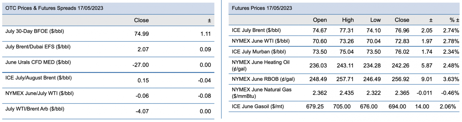 The two major crude oil contracts finished the day $2/bl higher, Heating Oil rallied $2.5/bbl equivalent, but they all looked sluggish compared to the $3.8/bbl equivalent advance in RBOB. Equity markets, assisted by a timely boost in US regional banks, proved a stalwart supporter of oil yesterday whilst concerns over the US debt ceiling seemed to have also eased somewhat.